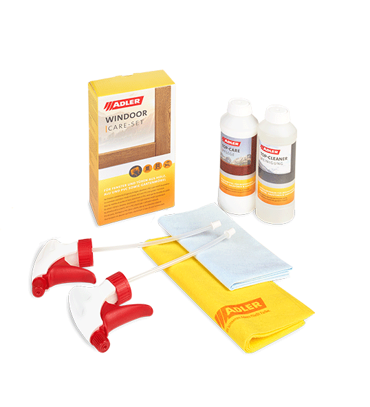 Um die ursprüngliche Optik von Fenster und Türen aus Holz, Alu und PVC zu erhalten, sollten diese 1- bis 2.mal pro Jahr gereinigt und gepflegt werden. Die Systempflege Windoor Care-Set von ADLER wirkt wasser-, öl- und schmutzabweisend. Mikrofeine Risse und Poren des Lackfilms verschließen sich und verlängern die Haltbarkeit.