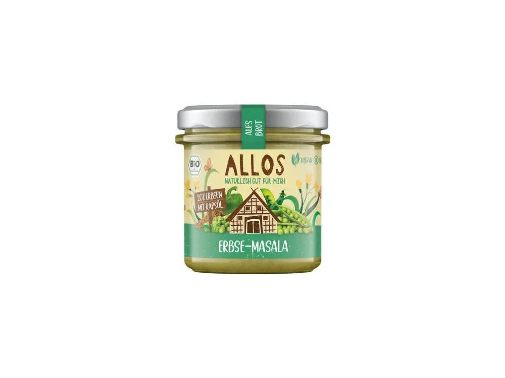Allos aufs Brot Erbse Masala ist ein besonders streichzarter Brotaufstrich. Extra cremig gerührt für einen intensiven, sortentypischen Geschmack. Das macht den Brotgenuss so besonders. Lactose-, hefe- und glutenfrei