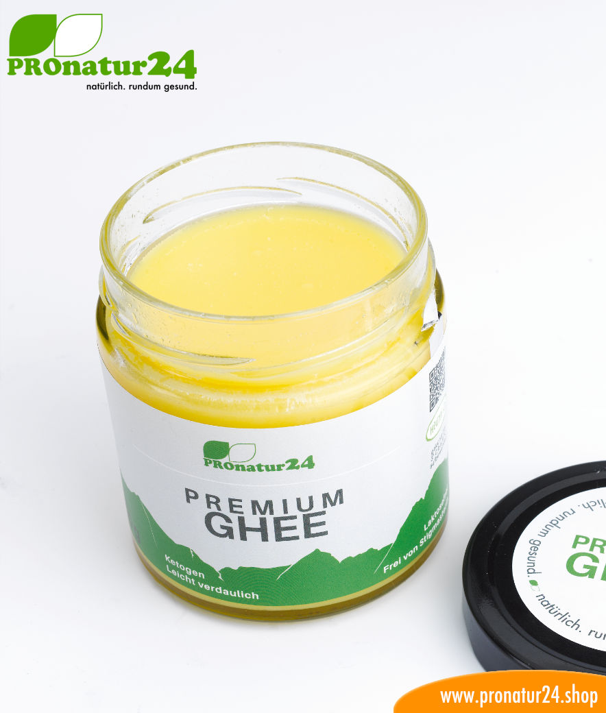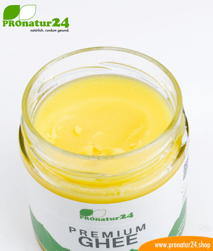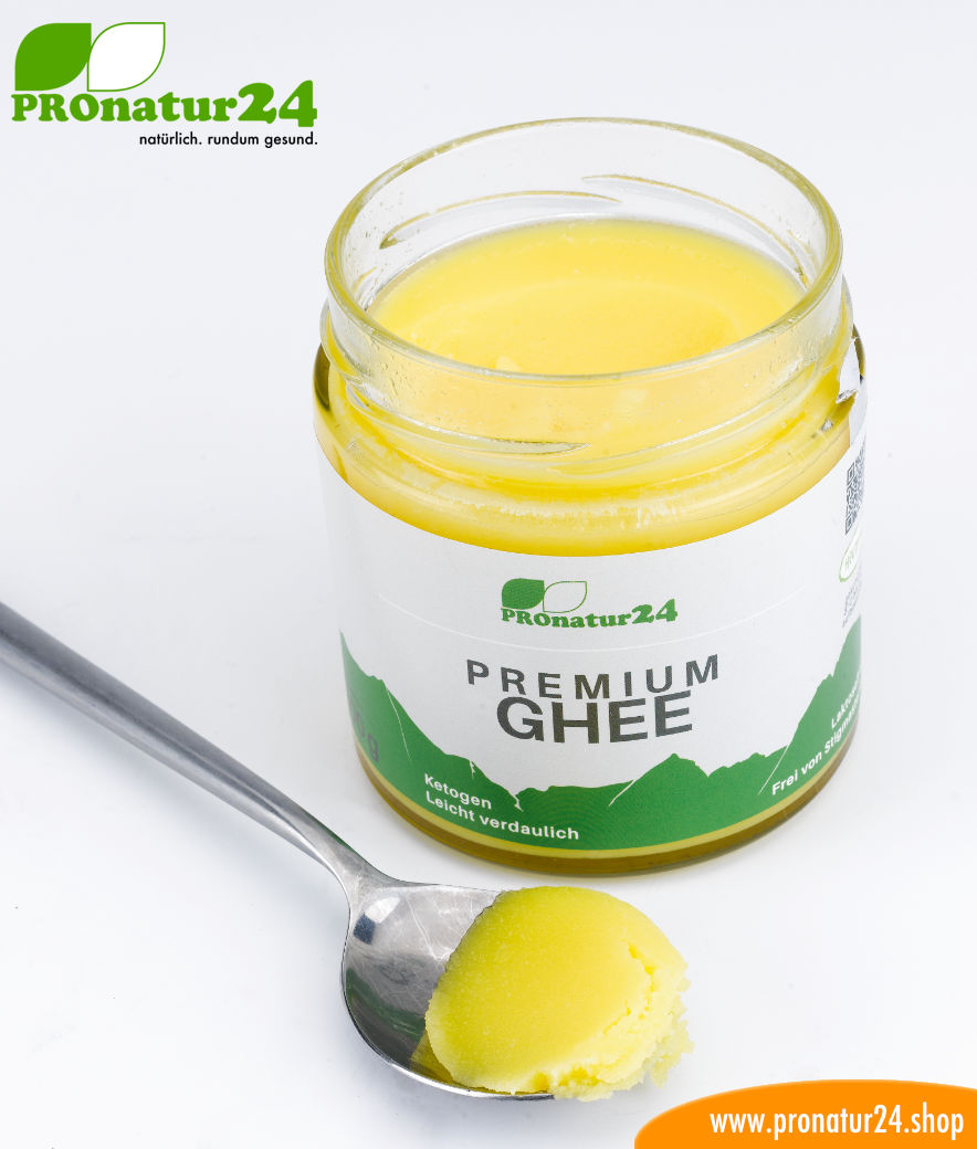 PREMIUM GHEE ist das Genussvollste was Ihrer Küche passieren kann. Ayurvedisches Butterschmalz aus 100% Heumilch. Eine Sensation fürs gesunde Kochen, Braten und Backen. Ideal für Low Carb und Ketogene Ernährung.