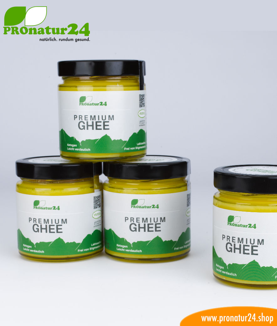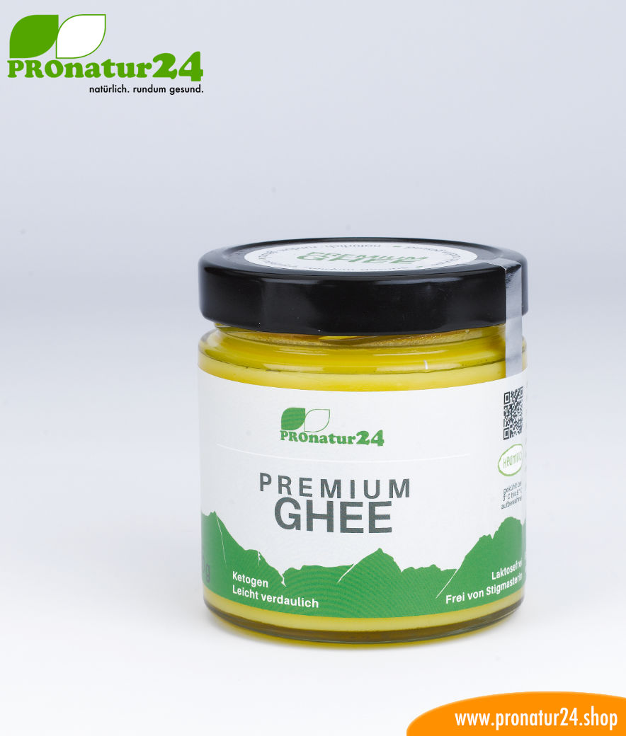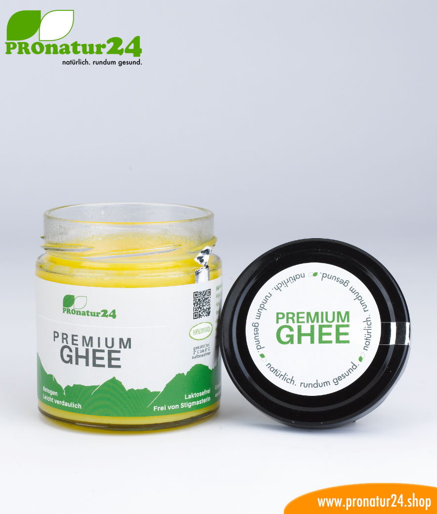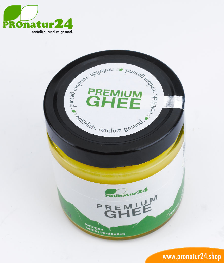 PREMIUM GHEE ist das Genussvollste was Ihrer Küche passieren kann. Ayurvedisches Butterschmalz aus 100% Heumilch. Eine Sensation fürs gesunde Kochen, Braten und Backen. Ideal für Low Carb und Ketogene Ernährung.