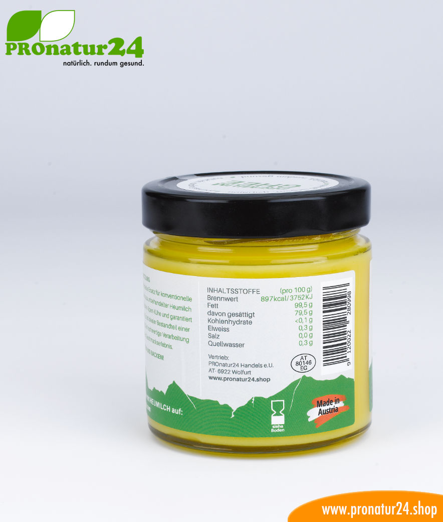 Unser PREMIUM GHEE wird aus bester frischer Süssrahm Sennereibutter aus dem Bregenzerwälder Alpen gewonnen. Die Basis dieser Butter ist 100% beste Heumilch, ebenfalls aus der Alpenregion Bregenzerwald im Westen Österreichs. Jede Genießerin und jeder Genussfreund von echter naturreiner Butter weiss ganz genau von welch enormer Qualität an Milch und nachfolgend Genuss wir hierbei sprechen.