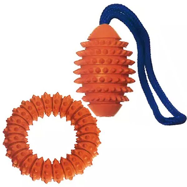 9.5 cm großes Spielzeug in Form eines Rugbyballs (mit Griff), und ein 12.5cm oder 15cm Aqua Boomer Ring für Hunde geeignet und aus orangen Vollgummi hergestellt.