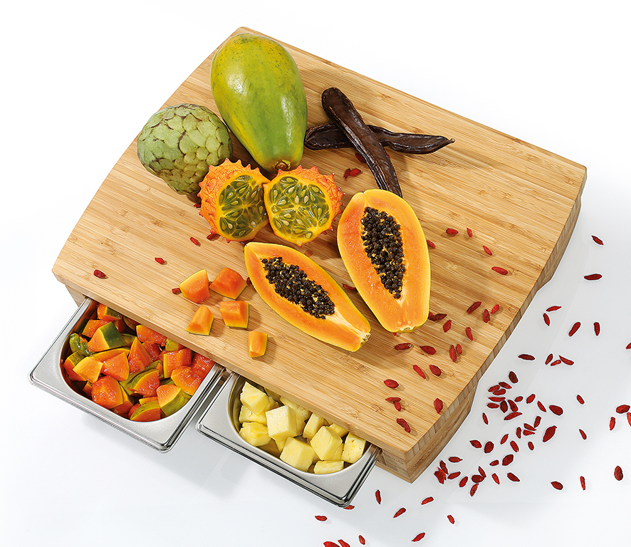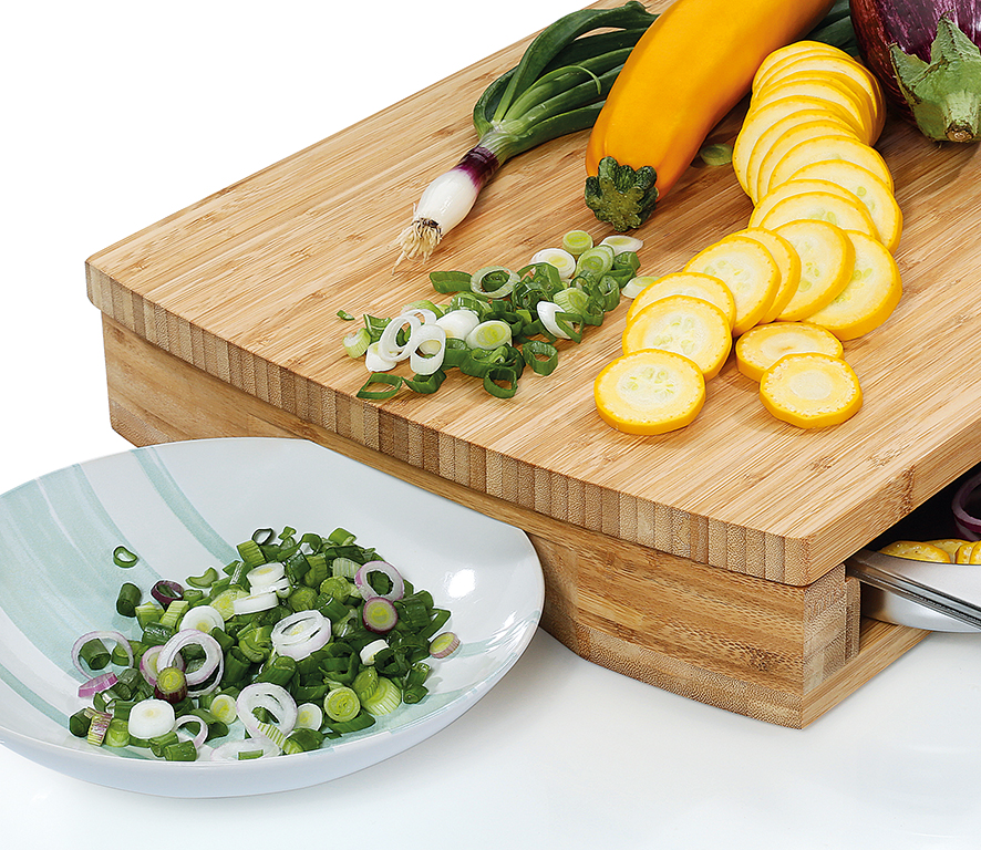 Ein praktisches Arbeitsbrett zum Schneiden und schnipseln jeglicher Lebensmittel. Die integrierten Auffangschalen ermöglichen ein leichtes Entsorgen von Schneidabfällen, das Separieren von Zutaten oder dient als kleine Transporthilfe des Geschnittenem. Dabei kann auch das Oberteil des Brettes, das durch Magnete auf dem Schubladenelement fixiert ist, einfach abgenommen werden und als einzelnes Schneidbrett verwendet werden, z.B. zum Schneiden des Brotes am Tisch. Das Brett wurde aus Plantagen-Bambus gefertigt, die Schale ist aus Edelstahl und kann somit ganz leicht gesäubert werden.