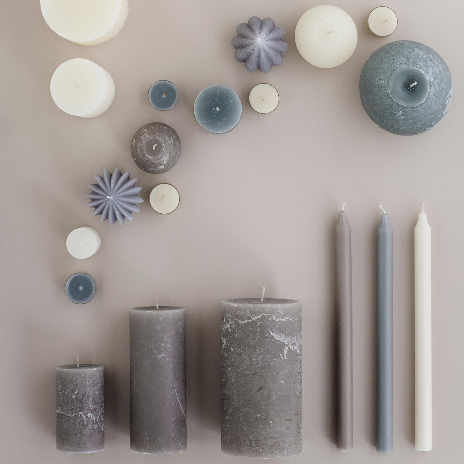 Die puristische Broste Copenhagen Stabkerze Steel Grey hat eine natürlich rustikale Optik mit flacher Krone und klassischer Kerzenform.