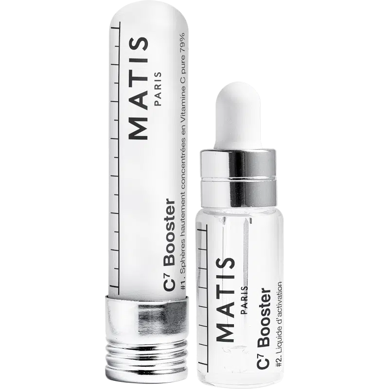 Avec le booster C7, Matis propose une nouvelle forme qui préserve toutes les propriétés de la vitamine C. La vitamine C est une molécule fragile qui s’oxyde à l’air et à la lumière et perd ses propriétés en quelques heures. Elle se présente ici sous une forme spécifique et innovante, pure et fraîche à chaque utilisation. La peau devient plus souple, les rides sont réduites et l’éclat est ravivé. La texture légère fond sur la peau et est rapidement absorbée. Destiné aux femmes de tous âges à la peau terne et fatiguée. Testé dermatologiquement.