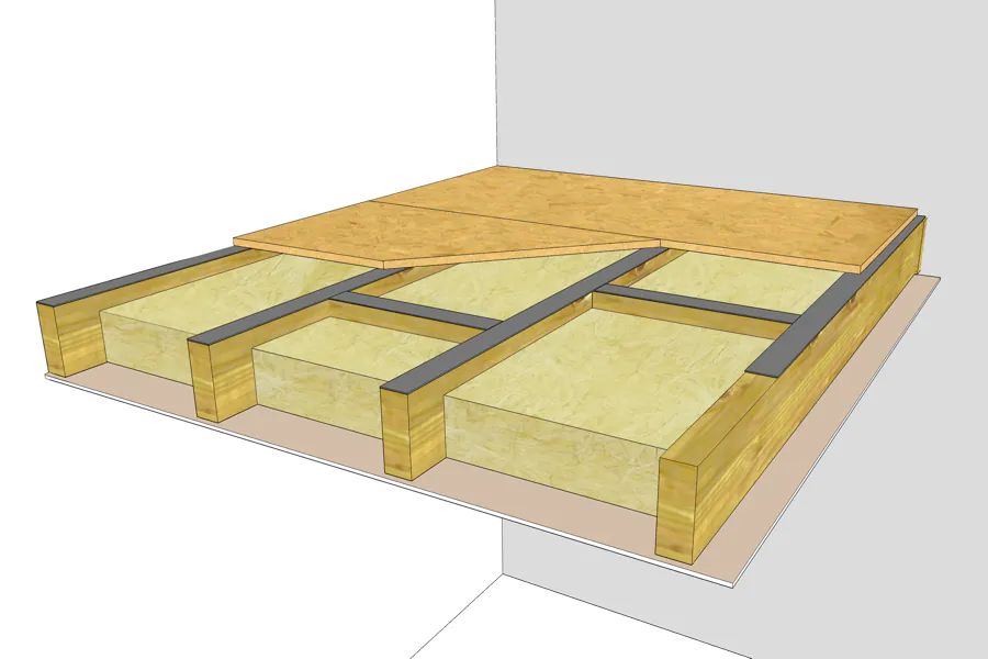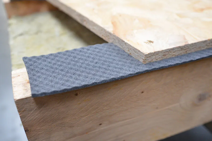 Wegen seiner Breite, Dicke und Materialdichte ist das Akustikband dB 4+ als Trennschicht zwischen Konstruktionsholz und die Holpaneele geeignet. Vor dem Verlegen der Bodenplatten entfernen Sie die Schutzfolie und kleben die dB Strip 4+ Akustikband-Streifen auf den Boden oder auf das Konstruktionsholz.
