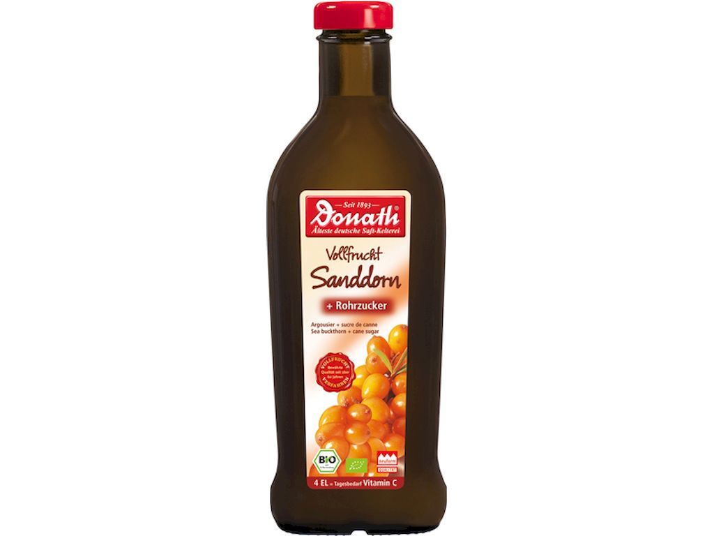 Fruchtzubereitung aus Sanddornbeeren, Rohrzucker und Apfelsaftkonzentrat: 36% Sanddornbeeren, 34% Saccharose (aus Rohrzucker), 29% Apfelsaftkonzentrat, Acerolasaftextrakt