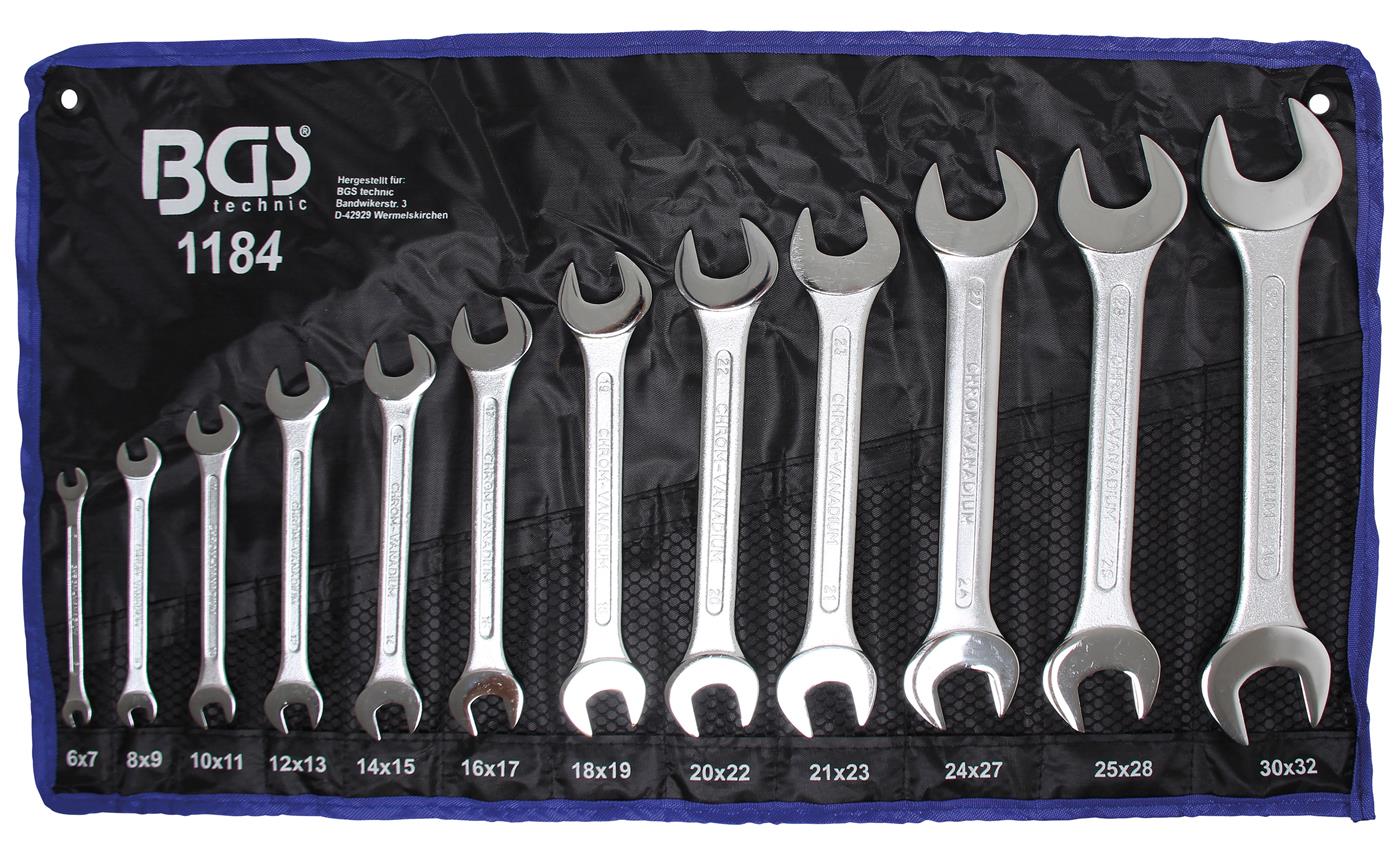 Doppelmaulschlüssel-Satz, 12-teilig in praktischer Rolltasche. Gehärtet und verchromt.