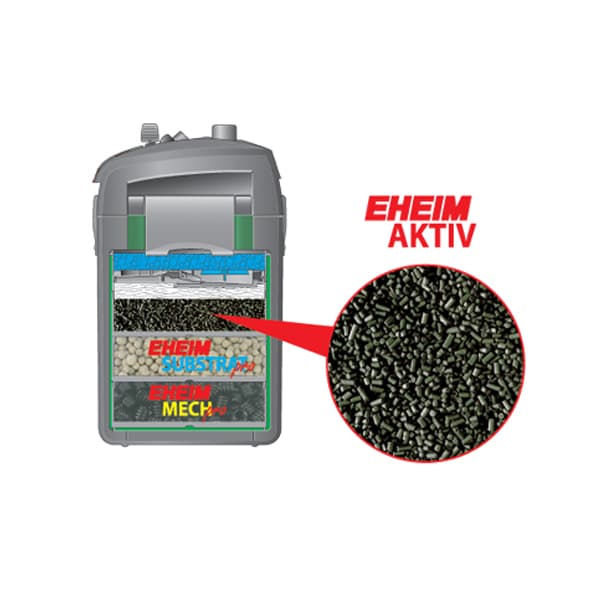 EHEIM AKTIV Filterkohle wird mit Säure gewaschen und zur Wasseraufnahme aktiviert (aktive Oberfläche 1200 m²/g). Auf diese Weise werden schädliche Chemikalien wie Pestizide, medizinische Behandlungsrückstände und andere Substanzen schnell gebunden und zurückgehalten.