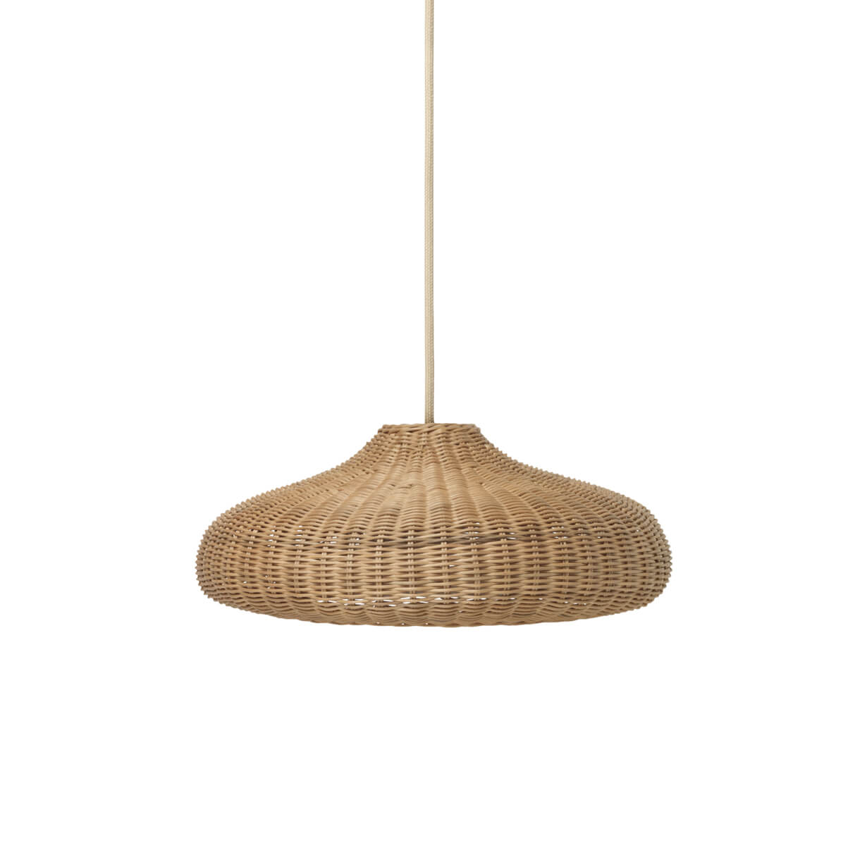 Die natürliche geflochtene ferm LIVING Lampe Disc hat ein Maß von ca. Ø 48 x H 20 cm und ist ohne Pendel.