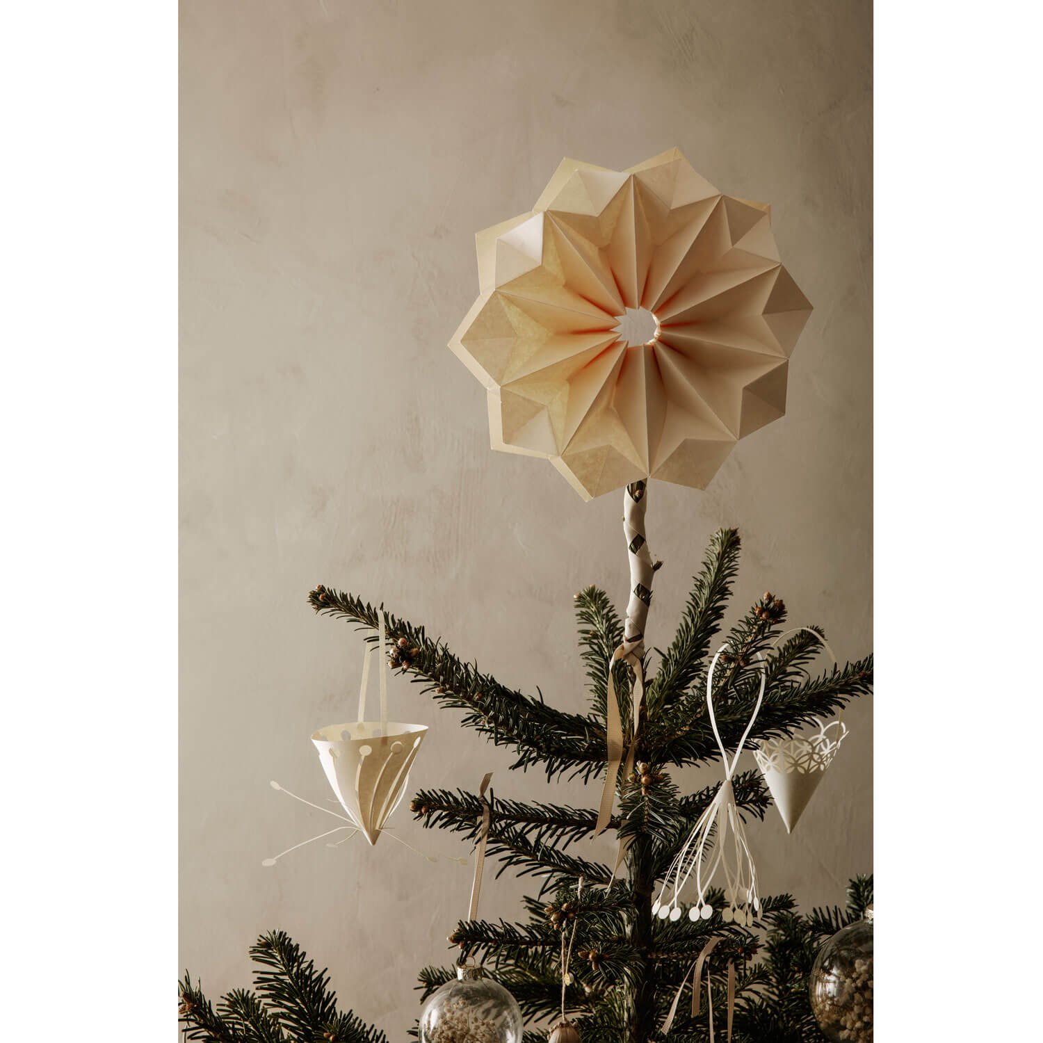 Mit dem wunderschönen ferm living Papierstern Sun verleihst du deinem Weihnachtsfest einen ganz besonderen Zauber. Mit ihm geht im wahrsten Sinne des Wortes die Sonne auf, was gerade in der dunklen Jahreszeit für Freude sorgt. Durch das helle Papier in cremigem Off-White sorgt er spielend für einen lichten Blickpunkt. Und das ganz ohne zusätzliche Beleuchtung. Der Stern wurde in Zusammenarbeit mit der dänischen Architektin und Künstlerin Amanda Betz entworfen. Er besteht aus FSC™-zertifiziertem Papier mit glatter, matter Oberfläche, ist lasergeschnitten und wird sorgfältig von Hand gefaltet. Mit diesem schönen Papierornament schmückst du dein Fenster oder aber auch deinen Weihnachtsbaum. Das beiliegende Band führst du dazu einmal um den Stern und im Anschluss um die Spitze des Baums, so, wie man einen Ballettschuh binden würde. Auch flach an der Wand macht der Stern eine tolle Figur. Das Modell Sun wird in einer schönen Aufbewahrungsbox geliefert, sodass er nach dem Gebrauch Jahr für Jahr sicher aufbewahrt werden kann.