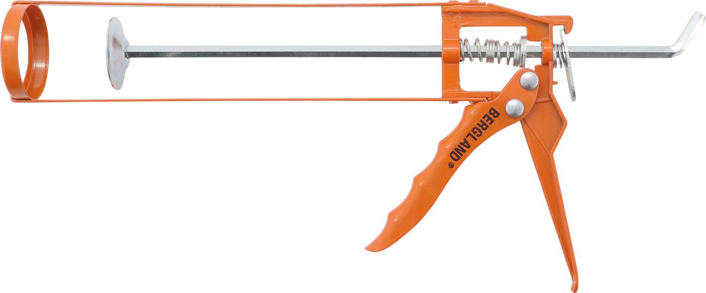 Kartuschenpresse, 300 mm Länge nach Skelett-Typ. Orange lackiert, handelsübliche Kartuschen.