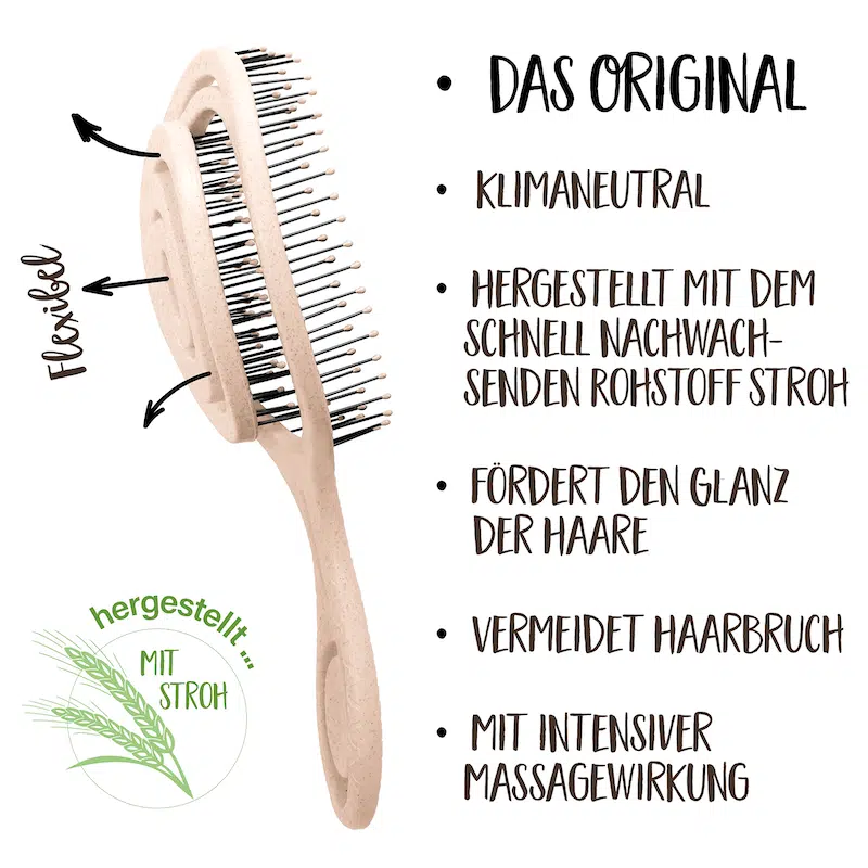 Avec cette brosse à cheveux, de la paille est ajoutée au plastique lors de la production. La paille de blé est principalement utilisée à cette fin, car de grandes quantités restent sous forme de déchets et ne peuvent pas être entièrement utilisées à des fins agricoles.