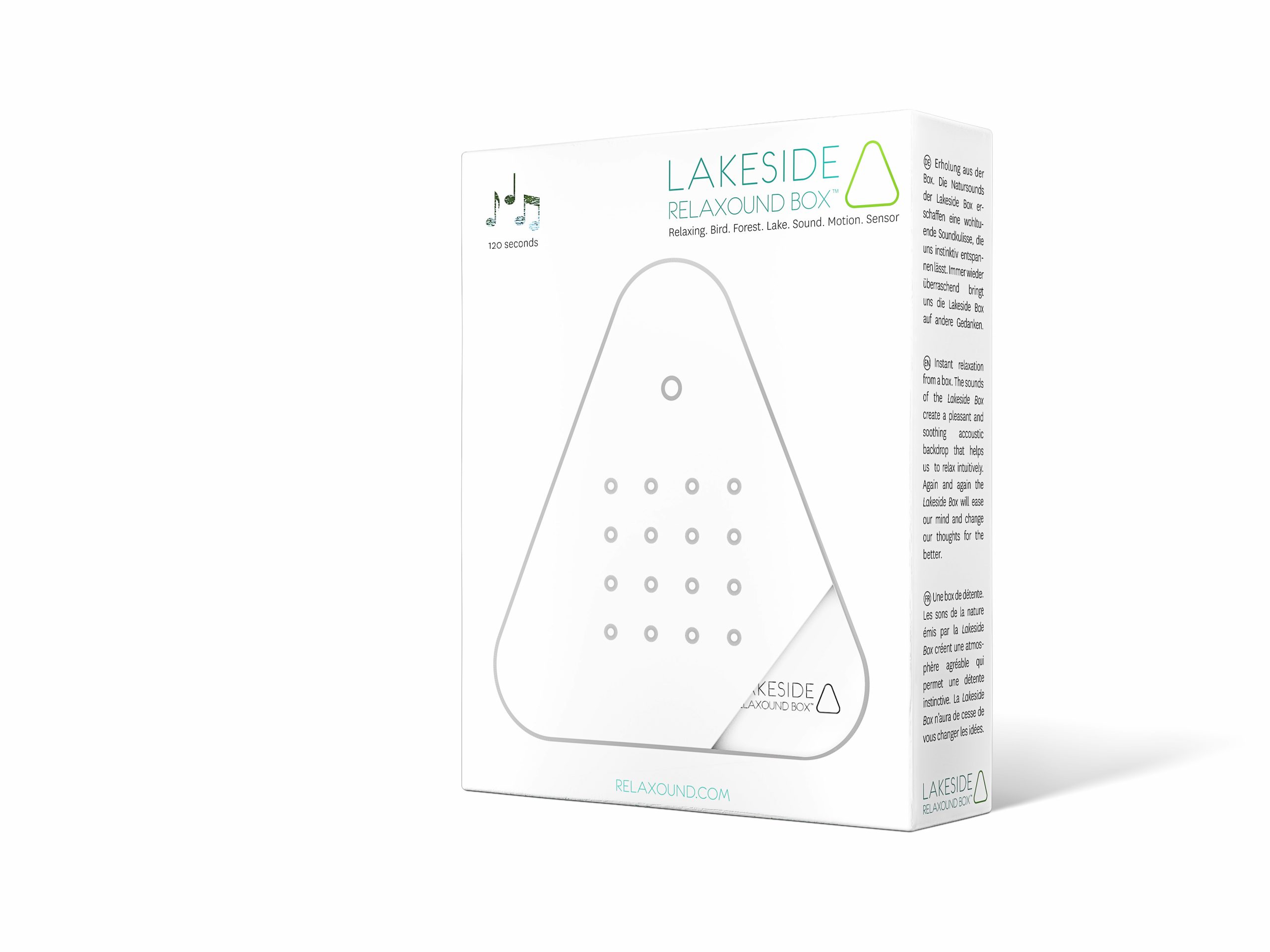 Die Lakesidebox zaubert kurze Momente der Entspannung in den Alltag. Beruhigende Natursounds entführen sanft an das Ufer eines idyllischen Waldsees: Wasser plätschert, Vögel zwitschern, Enten schnattern, Grillen zirpen. Dabei wird der Natursounds einfach im Vorbeigehen aktiviert. Ein Bewegungsmelder löst die inspirierende Klangkulisse aus und lässt uns für zwei Minuten innehalten und Kraft tanken.