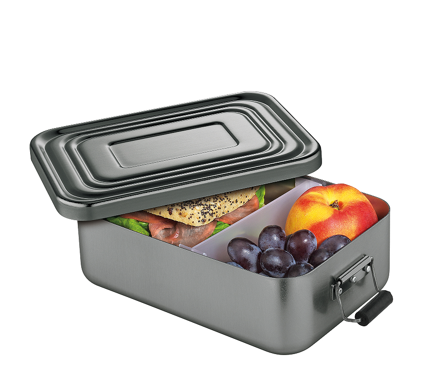 In der Aluminium-Lunchbox mit dicht schließenden Verschlüssen bleibt der Inhalt lange frisch. Der Deckel ist mit einer Silikondichtung versehen. Eine variabler Trennleiste erleichtert die Aufbewahrung verschiedener Lebensmittel.