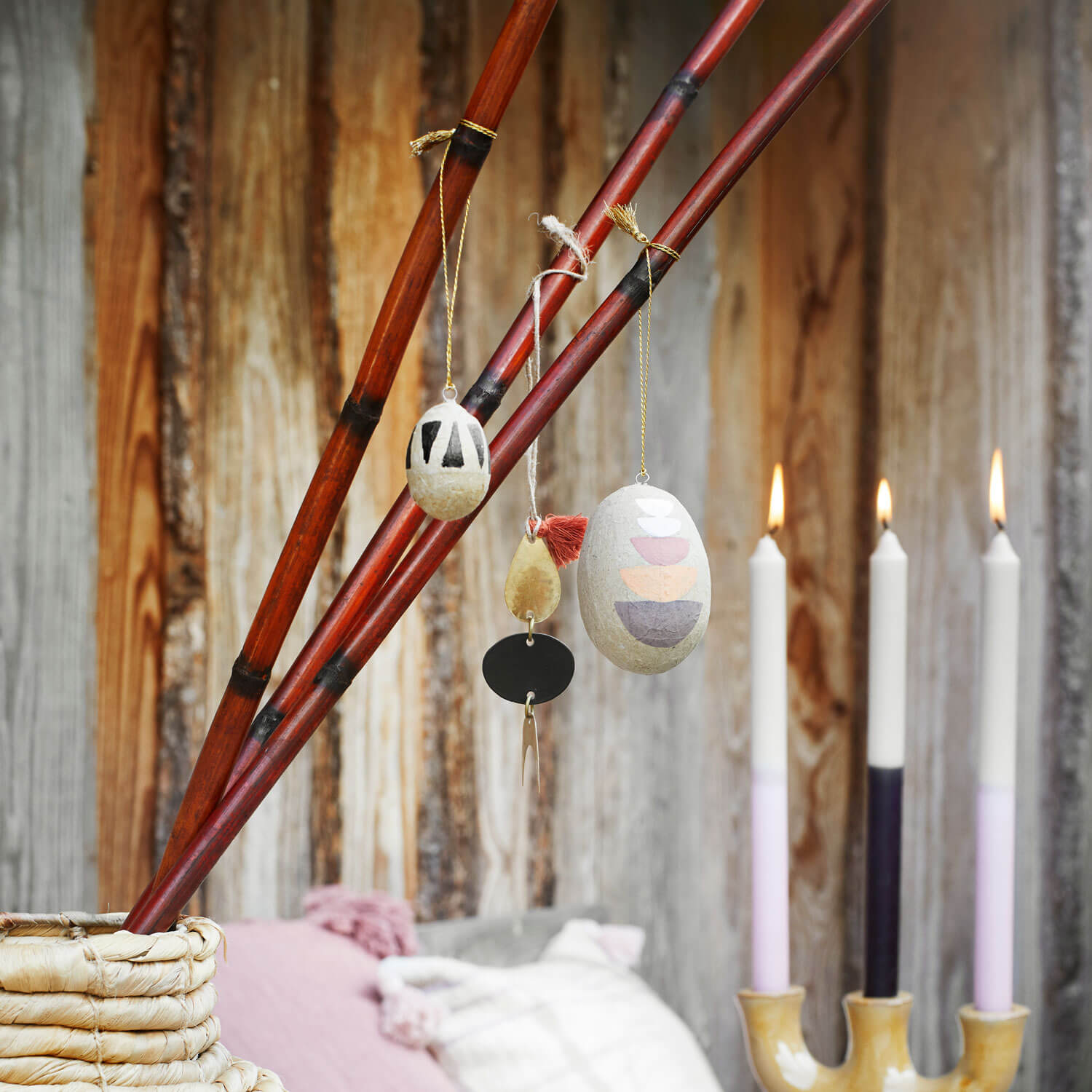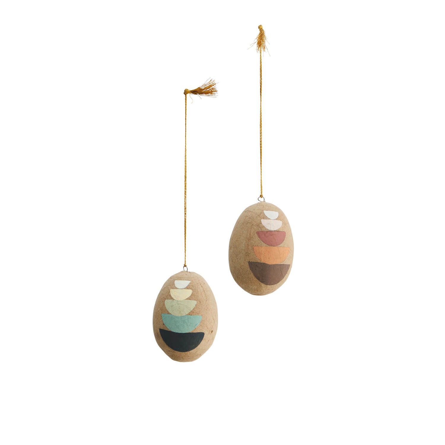 Das Madam Stoltz 2er-Set Osterei ist aus Pappmaché und ein Ei misst ca. H 7 cm (ohne Schnur). Das Osterei wird aufwendig von Hand aus recyceltem Papier hergestellt. Es ist schlicht, schön und unerlässlich für deine stilvolle Osterdeko. Das Highlight an den beiden Eiern ist die ungewöhnlich schöne Bemalung – ein Ei in Rosé-Taupe Tönen und das andere in Grünen Farbnuancen.