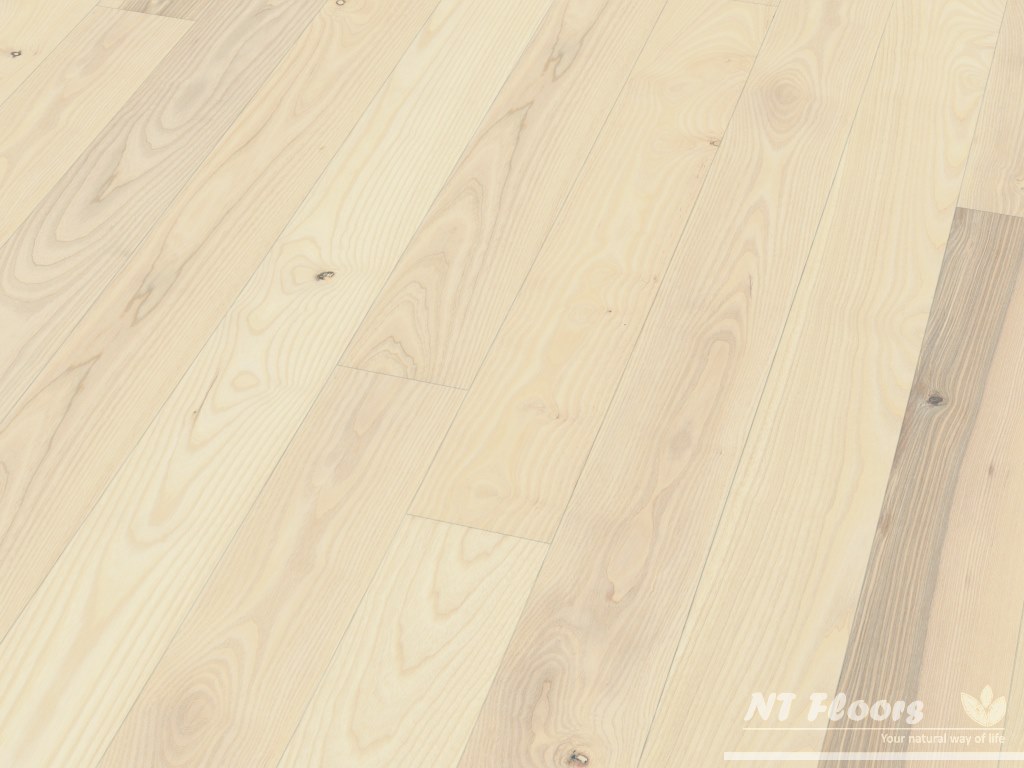 Die NT Floors Massivholzdiele Esche Natur weiß wirkt natürlich und in sich homogen. Die Massivholzdiele Esche Natur hat Äste. Punktäste dürfen ebenso vorkommen. Braunkern ist in der Natur Sortierung zulässig. Insofern überzeugt die Massivholzdiele Esche Natur weiß sprichwörtlich durch ihren hellen, dezent gelblich-braunen Farbton. Dieser entsteht durch den Auftrag von weiß pigmentiertem Holzbodenöl. Infolgedessen kommt der Holzfarbton durch den Ölauftrag zu Stande und wird durch den Einfluss von UV-Licht später unwesentlich verstärkt. Wegen ihrer Natürlichkeit trägt die Massivholzdiele Esche Natur weiß zu einem wohnlichen Ambiente im Haus bei.