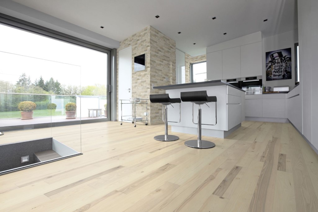Massivholzdielen Esche Natur weiß bieten wir mit zwei Oberflächenstrukturen an. Als erstes kaufst Du fein geschliffene Dielen. Wenn Du es magst, bürsten wir die Dielen im Werk. Dadurch kommt die Holzstruktur dreidimensional zum Vorschein. Infolgedessen erhältst Du zusätzlich noch eine härtere Oberfläche, ein exzellentes und einzigartiges Holzbild sowie ein “Gehfühlserlebnis” der Extraklasse. Durch die nahezu fertige Oberfläche sparst Du an Zeit bei der Verlegung und im Bauablauf. Nach der Verlegung ist nur noch die Erstpflege notwendig.