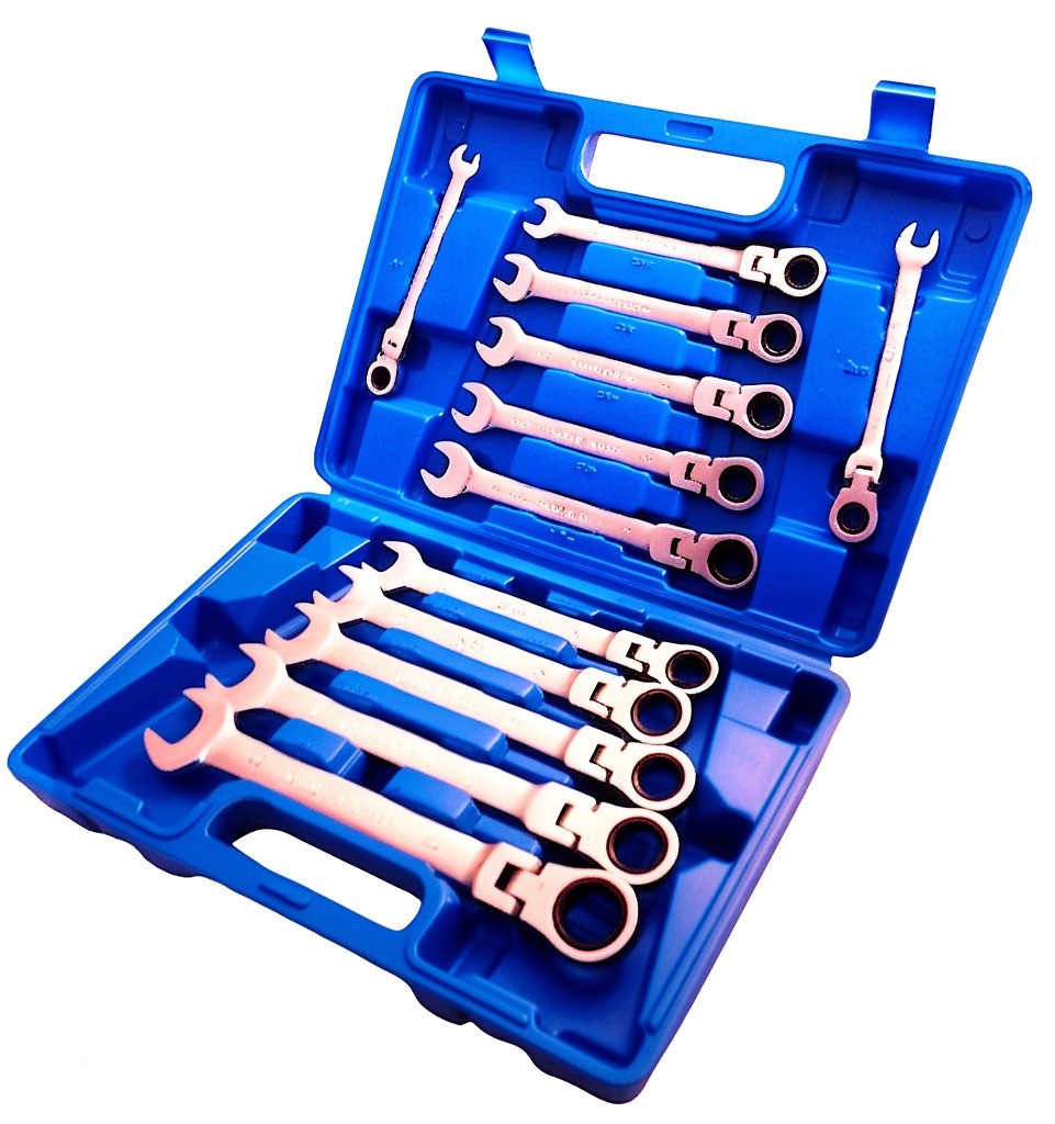 Der 12-teilige Satz kombiniert Maulschlüssel und Ringratsche mit Schwenkgelenk für vielfältige Einsätze in Werkstatt, Haushalt oder Kfz-Bereich.