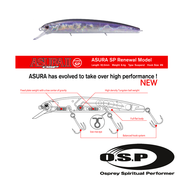 Der ASURA ist der erste Jerkbait der Welt, der bei einem Körper der 9cm-Klasse mit 3 Drillingen ausgestattet ist. Die drei Haken dienen der Steigerung der Bissausbeute und der Reduzierung von Fehlbissen – ansonsten oft ein Problem bei Jerkbaits in dieser Größe. Durch seine einzigartige, schwerpunkt-verlagerte Konstruktion, erreicht der Asura Wurfweiten, wie sie sonst kein anderer Jerkbait dieser Größe erzielt. Aufgrund seiner abgeflachten Körperform flankt der Asura stark auf und zeigt sogar beim einfachen Einkurbeln eine starke „jerking-action“. Ohne zu übertreiben: Der Asura ist eine Revolution im Bereich der Jerkbaits.