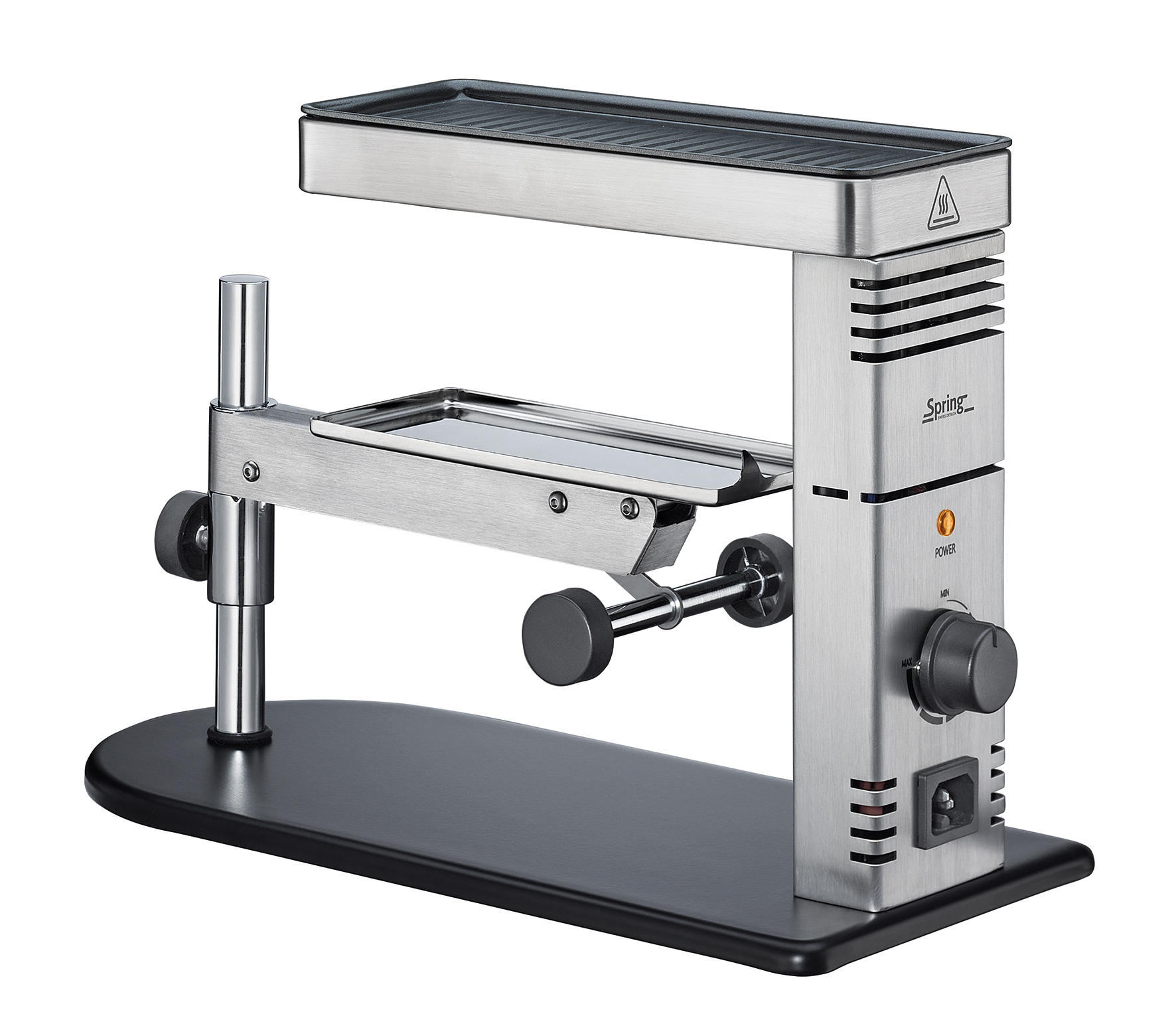 [vc_row][vc_column][vc_column_text] Purer Genuss und puristisches Design. Der Raclette-Ofen CHALET von Spring aus gebürstetem Edelstahl ist der Hingucker beim gemütlichen Abend mit Freunden oder der Familie. Im Mittelpunkt steht der cremig geschmolzene Raclette Käse. Er präsentiert sich in seiner ganzen Pracht auf dem höhenverstellbaren und 360° schwenkbaren Käsehalter. Auf der antihaftbeschichteten Grillplatte können knuspriges Baguette, Pilze, Zucchini, Fleisch, Scampi oder halbierte Feigen gegrillt werden. Zum mühelosen Servieren kann die Käseauflage geneigt werden. Die Temperatur des Raclette-Ofens kann stufenlos geregelt werden, der Schaber mit glatter und gezackter Kante rückt dem Käse effektiv zu Laibe.
