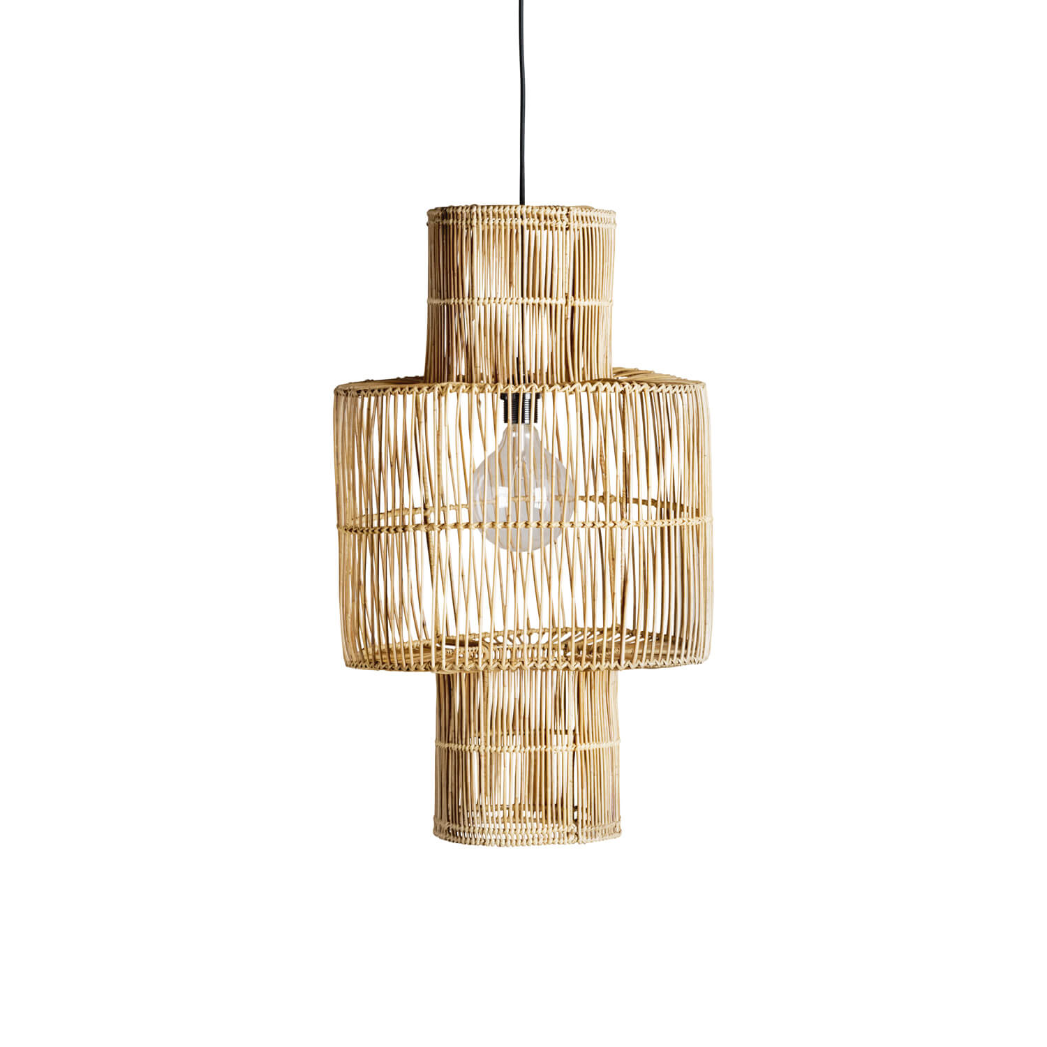 Das Design des Lampenschirms ist angelehnt an frühere Vogelkäfige. Der Lampenschirm wirkt sehr fein und kann genauso gut allein in der Ecke eines Raumes sowie auch in einer spannenden Kombination mit anderen Rattanlampenschirmen von Tine K hängen.