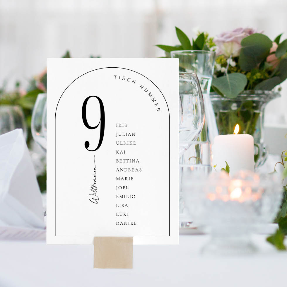 Gestaltet absolut individuelle Gruppentischkarten mit Bogendesign für jeden Tisch oder nutzt sie für einen Tischplan: